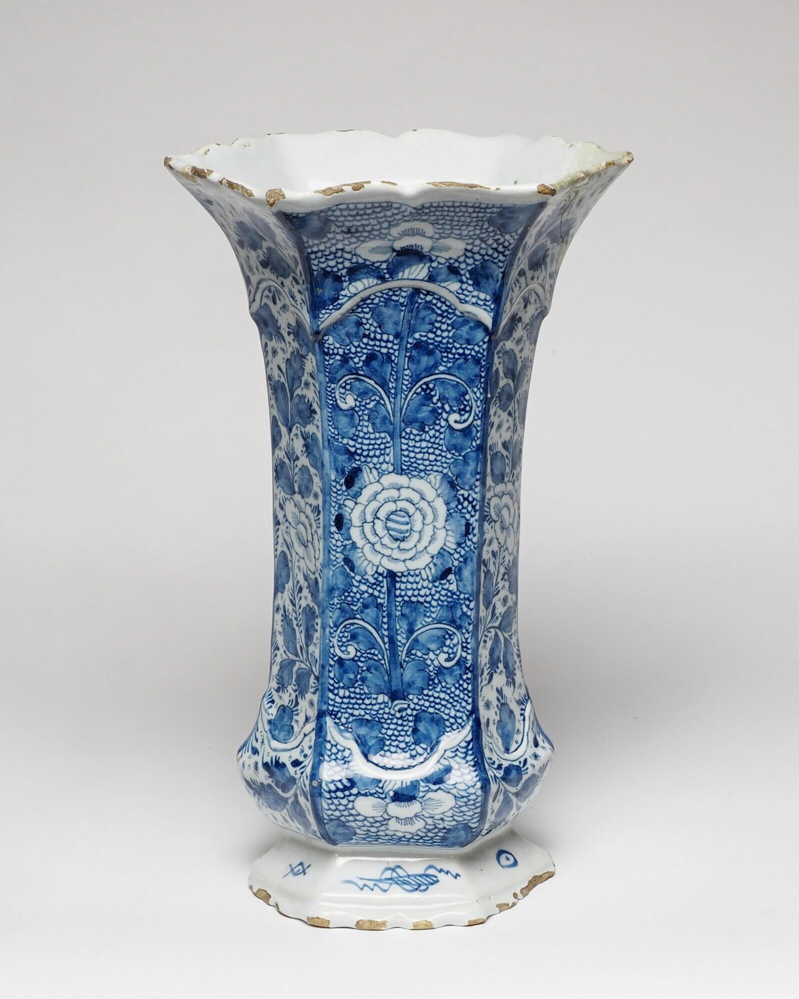 Zeskantige bekervaas met geaccoleerde boven- en onderrand, met verdikte convexe voet en dito hals, op het breedste vlak een bloem tegen een doorlopende streep op schubben achtergrond, de smallere flankerende vakken zijn voorzien van strooibloemen, op de daarnaast gelegen vakken een groot rankornament in driehoekvorm, aan de achterzijde en op de voet Chinese motieven en gelukstekens (Nederlands)