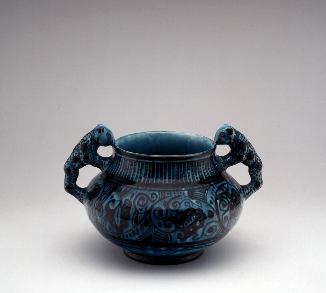 Bolvormig vaas met aan weerszijden een oor in de vorm van een staande panter en gedecoreerd met florale en lineaire motieven. (Nederlands)
