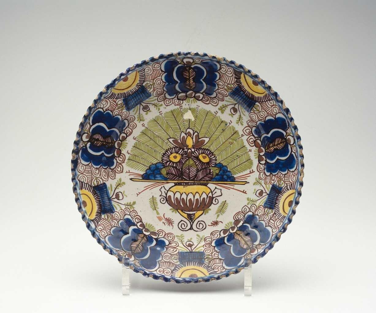 Een zogenaamd pauwenbord met op het plat een vaas met in waaiervorm gerangschikte pauwenveren. Rand versierd met afwisselend een dubbel bladmotief en een bloempot met spiraalmotieven. Randschade en gat in plat opgevuld. Een zogenaamd pauwenbord met op het plat pauwenveren in een vaas en op de rand halve bloemmotieven en halve cirkels tegen een achtergrond van spiralen. (Nederlands)