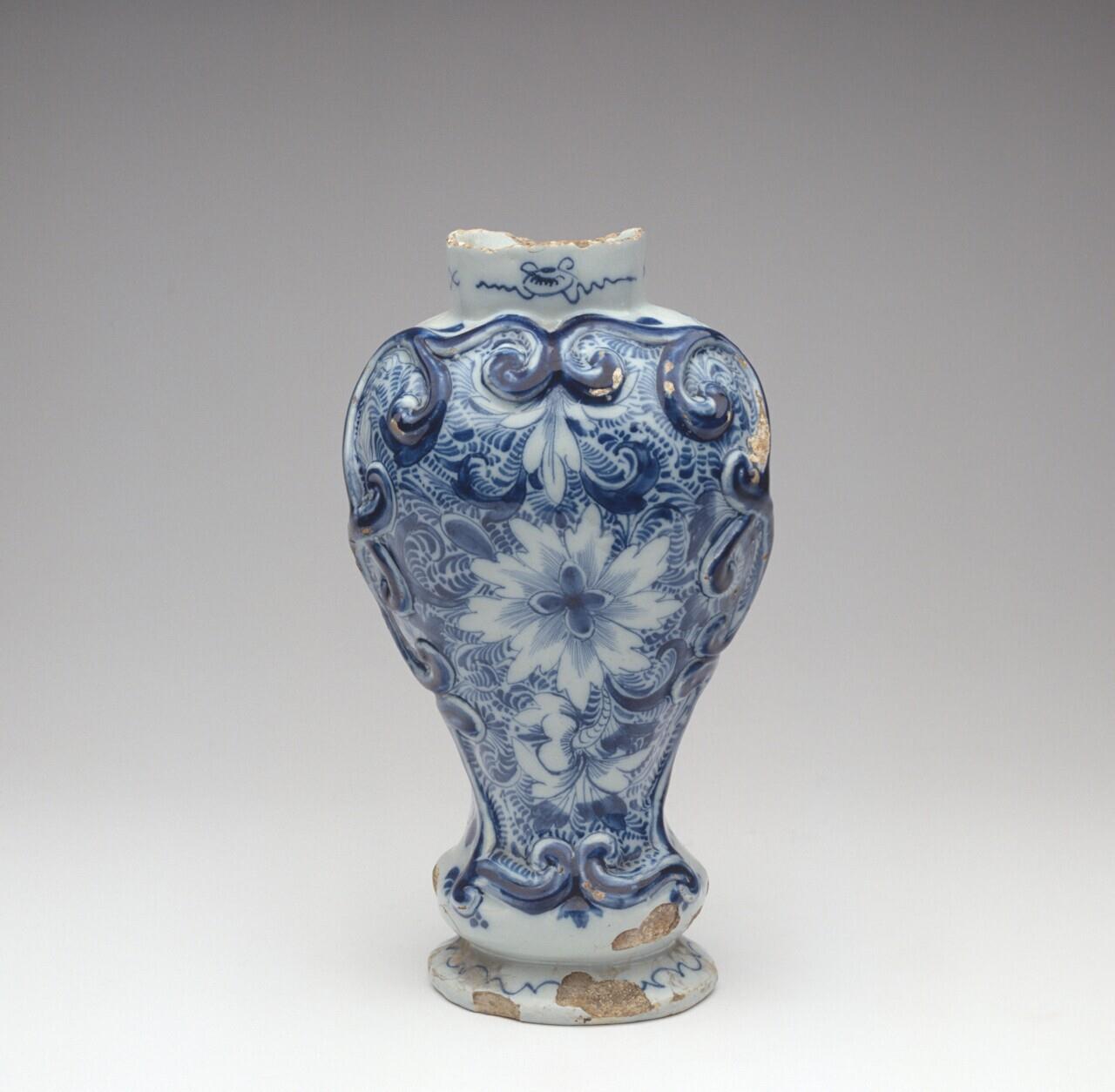 Dekselvaas, deksel ontbreekt, beschilderd met bloemen in blauw onderglazuur. (Nederlands)