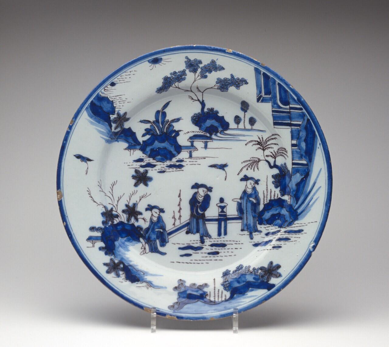 De schotel is aan de achterkant voorzien van een standring. Bij het aanbrengen van de voorstelling aan de voorkant is geen rekening gehouden met de overgang van het middenvlak naar de rand. Doorlopende voorstelling in Chinese overgangsstijl met drie figuren op een terras omgeven door kleine landschapjes. (Nederlands)