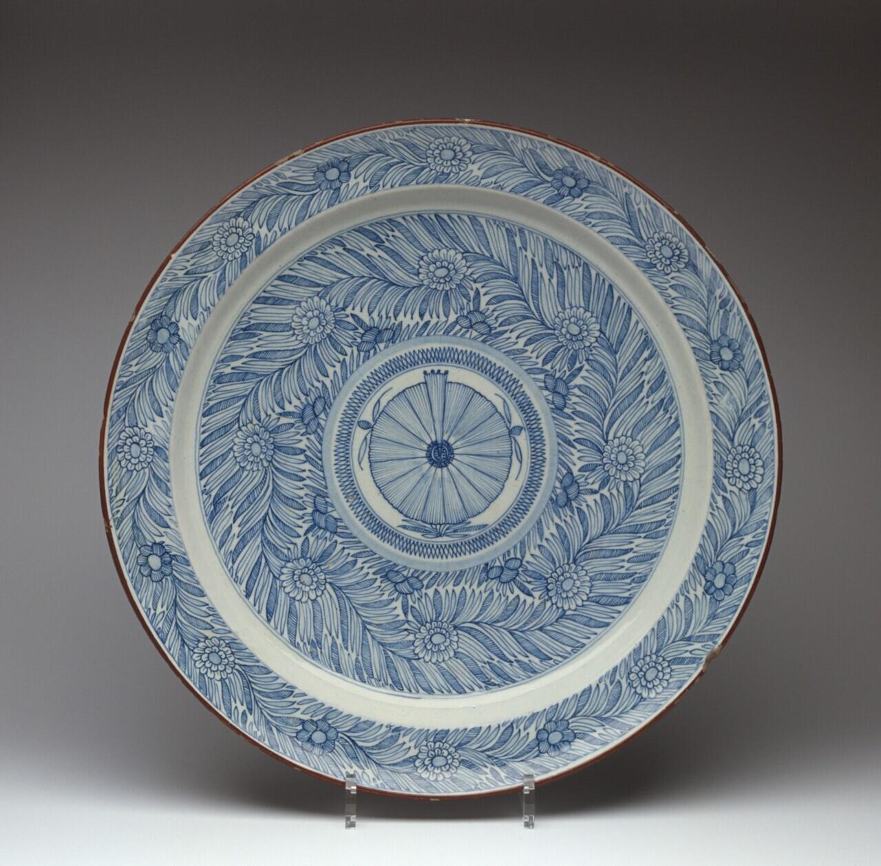 Bord met op het plat in lichtblauw een rozet, omgeven door bloemtakken. Op de rand een zelfde ornament. Schade aan het glazuur aan de randen. (Nederlands)