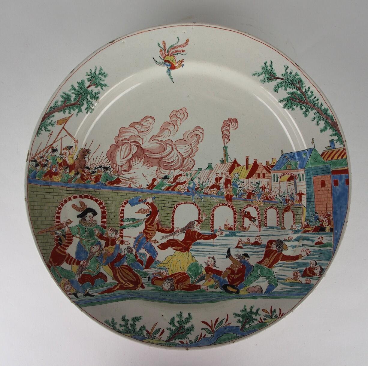 Bord met de verovering van Maastricht door de hertog van Parma in 1579. Strijdende soldaten op brug over de Maas ook langs de oever. In de lucht een duikende vogel. (Nederlands)