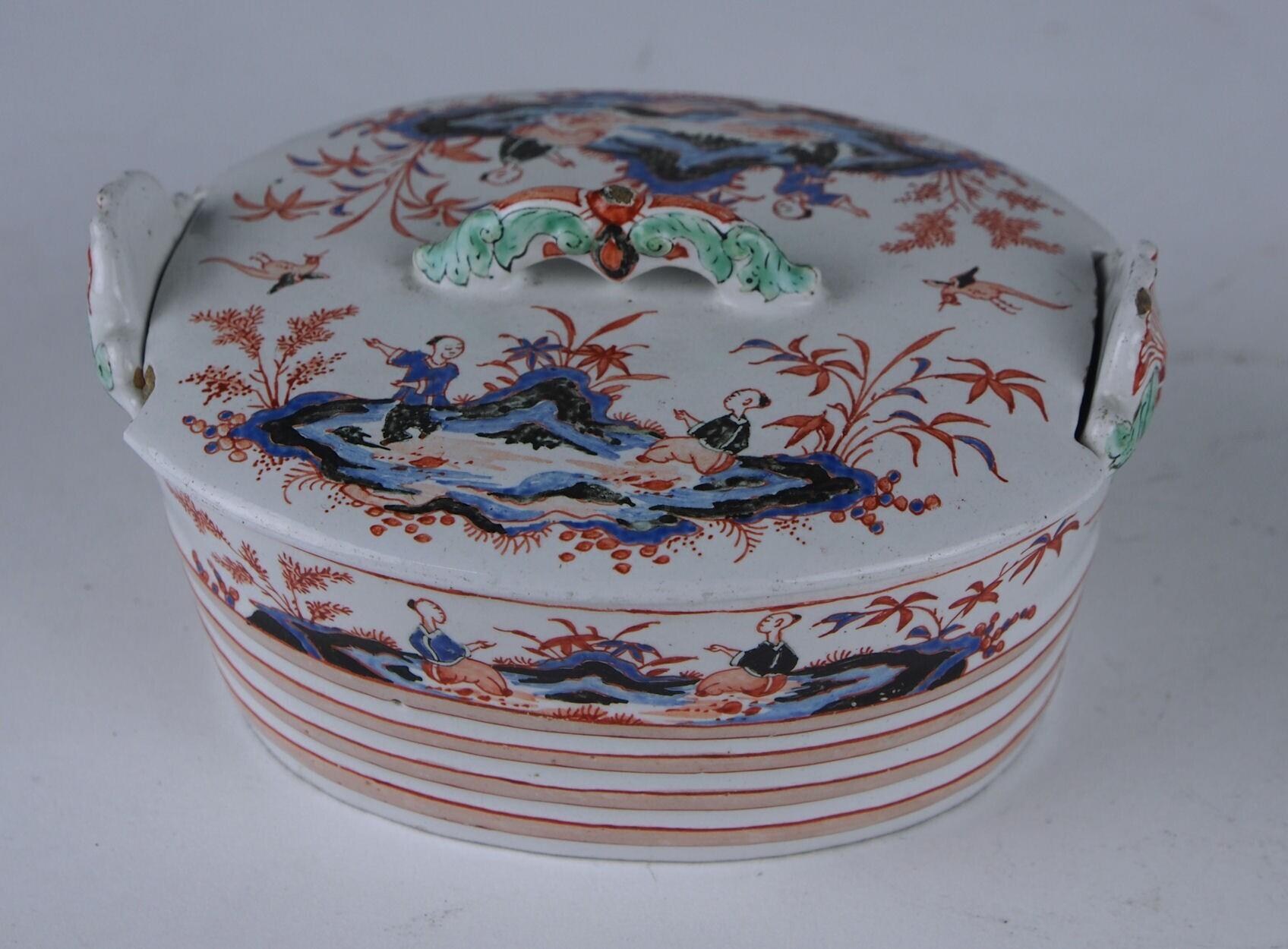 Ovale botervloot met opstaande schelpvormige oortjes en deksel met opstaand handvat. Het kuipje is aan de bovenkant versierd met Chinezen en aan de onderkant met vier banden. Schade aan de uitstekende delen. (Nederlands)