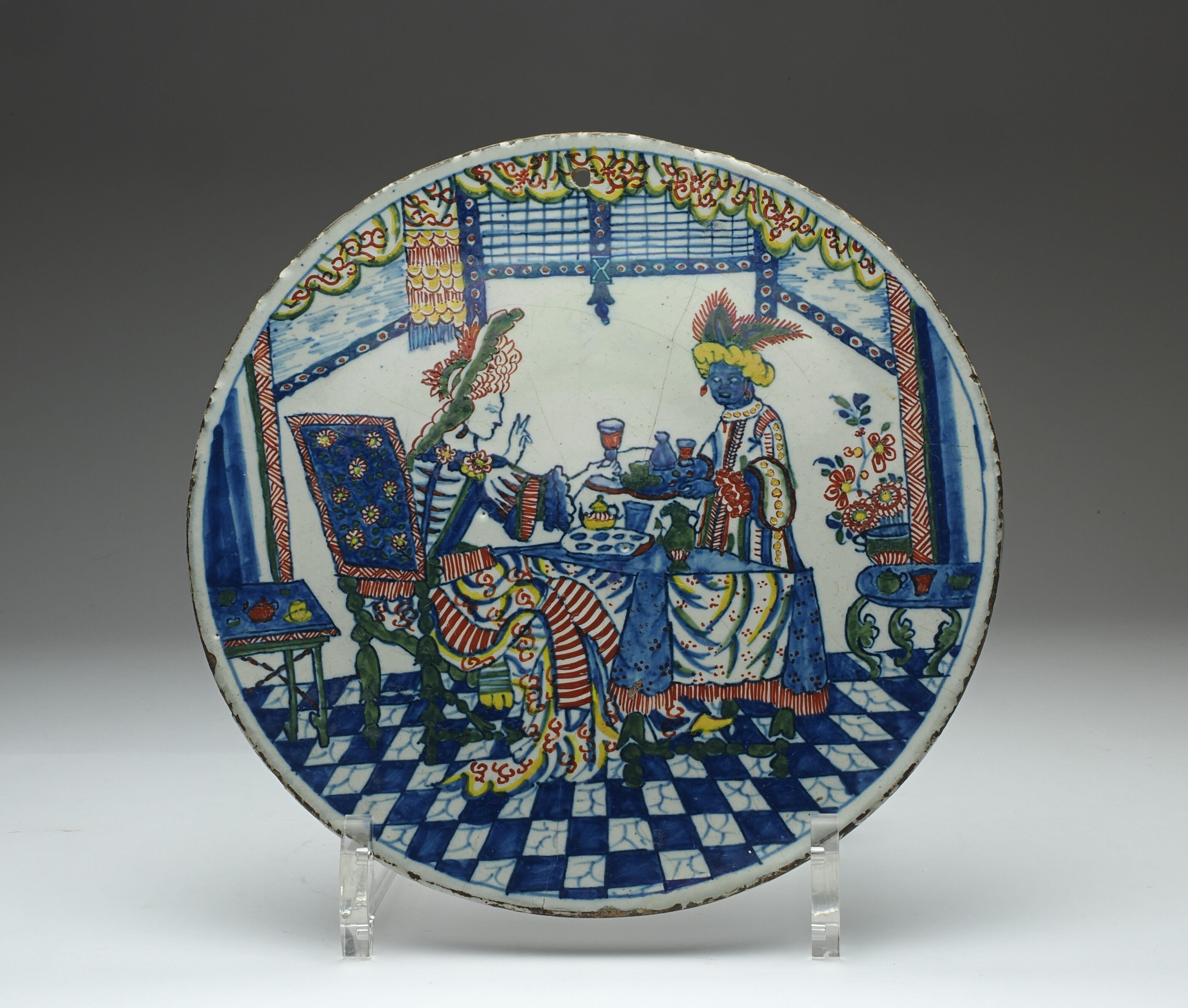Ronde, platte plaque met breed standvlak met over het gehele vlak een voorstelling van een dame zittend aan een tafeltje, die een glas afneemt van dienblad dat haar wordt voorgehouden door in oosterse kleding gehulde zwarte bediende. De modieus geklede dame heeft een fontange kapsel en draagt platte hoed. Op de tafel ligt een kleed en staat nog meer gerei. Links en rechts staat een Chinees tafeltje - de een met rechte, de andere met gebogen pootjes - met serviesgoed. Op de achtergrond draperieën, kamerscherm en bloempot. De vloer is belegd met zwart en wit marmer. Het tafereel is omlijst met een smalle witte rand. (Nederlands)