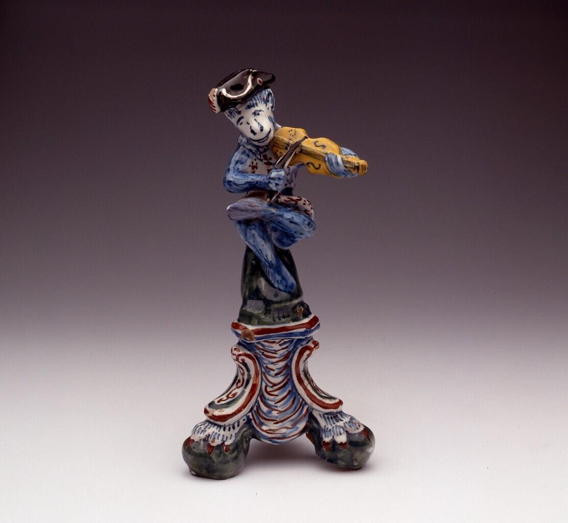 Beeldje van een zittend vioolspelend aapje op een voetstuk bestaande uit voluten. (Nederlands)