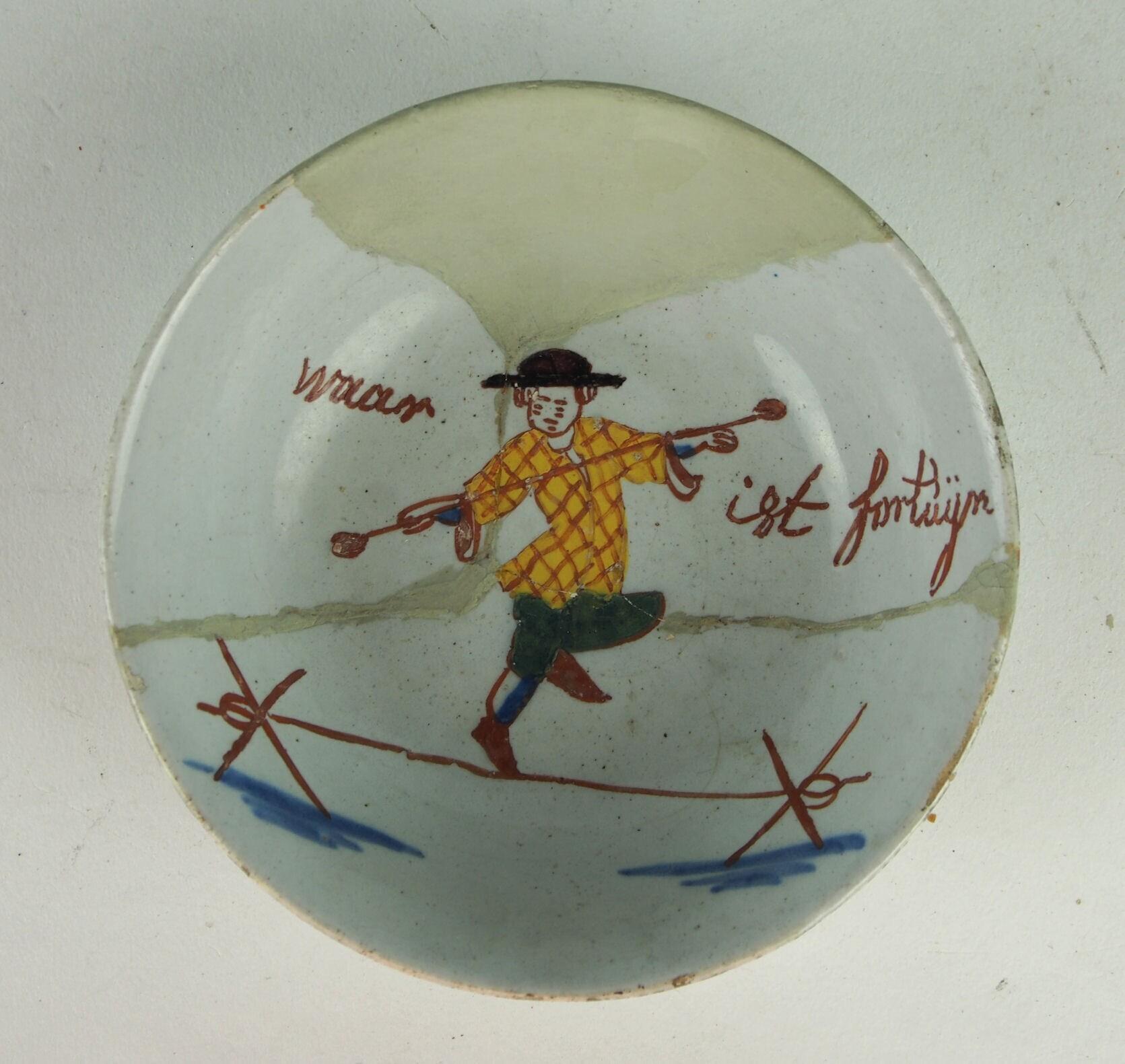 Kom met een voorstelling van een koorddanser, met opschrift 'waar ist fortuijn'. Is gerestaureerd. (Nederlands)