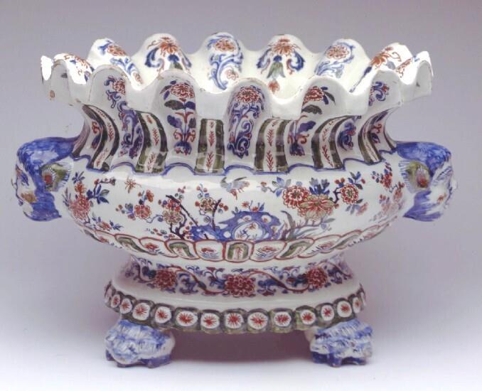 Bolvormige glazenkoeler met geplooide rand op leeuwenpoten. De handvatten zijn in de vorm van engelenhoofden. Het vat is versierd met planten, vogels en bloemen. De vorm van de wijnkoeler is Europees, maar de decoratie is gebaseerd op dat van Chinees famille verte porselein. Deze Franse term betekent dat groen de hoofdkleur is van de totale versiering. In de buik van het vat werd ijs gedaan. De wijnglazen werden met de voet in de geplooide rand gehangen met de kelk in het ijs, zodat deze gekoeld werd. Ook de fles wijn werd in de koeler geplaatst. Dit exemplaar glazenkoeler is bijzonder vanwege haar vorm en decoratie. De glazenkoeler is een echt luxeproduct dat rond 1680 in Engeland ontstond. Eerst werd dit object in zilver gemaakt, maar al vlug volgden er kopieën in keramiek. Waarschijnlijk is de vorm van dit Delftse exemplaar in eerste instantie geïnspireerd op zo’n Engels zilveren voorbeeld. Deze zilveren glazenkoelers zijn namelijk vaak gedecoreerd met leeuwenpoten en leeuwenkoppen als handvatten. Het klassieke element van de engelenkoppen zou afkomstig kunnen zijn van ontwerptekeningen van bijvoorbeeld Daniël Marot zoals te zien is op het titelblad van 'Nouveaux Liure d... (Nederlands)