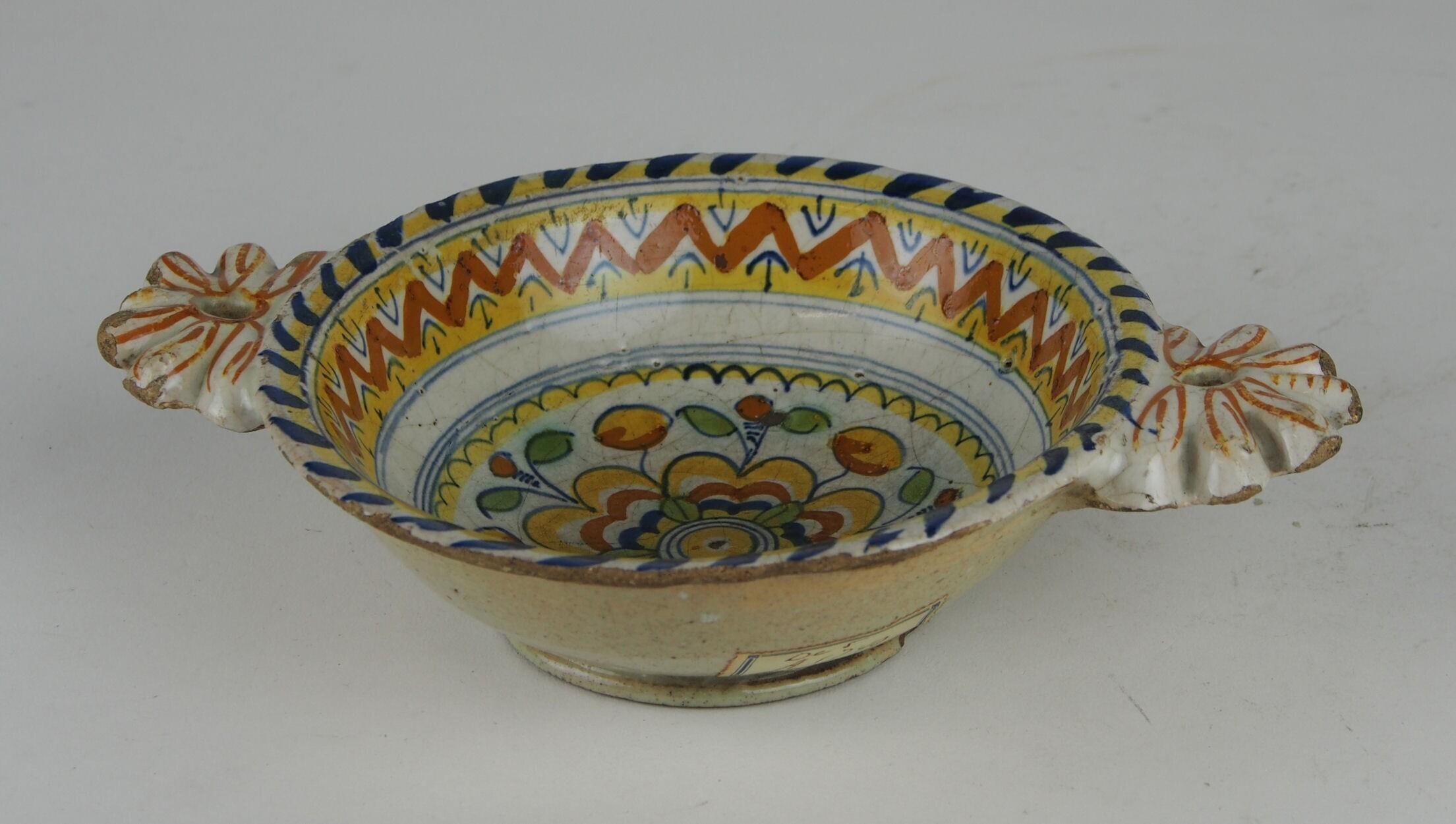 Papkom met twee liggende oren in de vorm van een half bloemmotief. Op het plat een rozet in een cirkel omlijsting. De wand versierd met zigzagornament. Schade aan het glazuur aan de oren. (Nederlands)