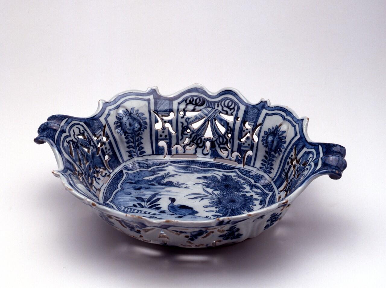 Opengewerkte mand met geschulpte wand en twee gekrulde handgreepjes. Wanden verdeeld in vakken (kraakstijl). Op het plat een eend in een landschap omgeven door een uit accoladen opgebouwde omlijsting. (Nederlands)