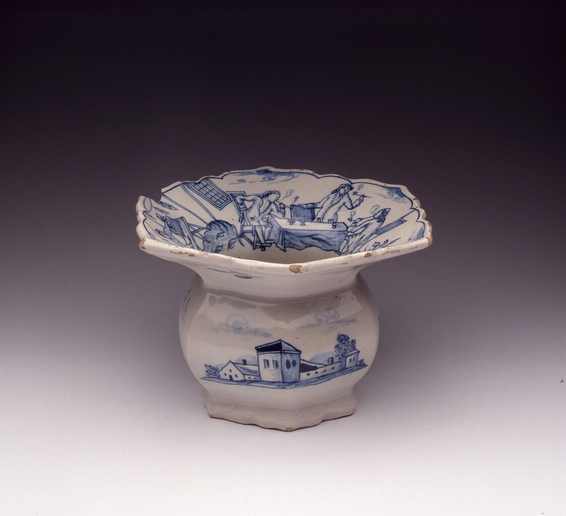 Zeshoekige kwispedoor met licht ingesnoerde voet en hals en zeszijdige geaccoleerde mond. Op de binnenwand drie scènes met betrekking tot tabaksteelt en -handel: het verbouwen, drogen, verkopen en roken van tabak, en op de buik tweemaal een plantagewoning. Aan de onderzijde van de mondopening bladmotieven en een dubbele concentrische ring. (Nederlands)