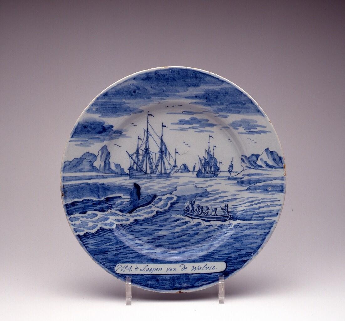 Bord met standring, vierde bord uit serie van twaalf borden met voorstellingen van de walvisvaart, met over de gehele voorkant in blauw geschilderde voorstelling 'lopen van de walvis'. Onderschrift 'No 4. 't Loopen van de Walvis.' (Nederlands)