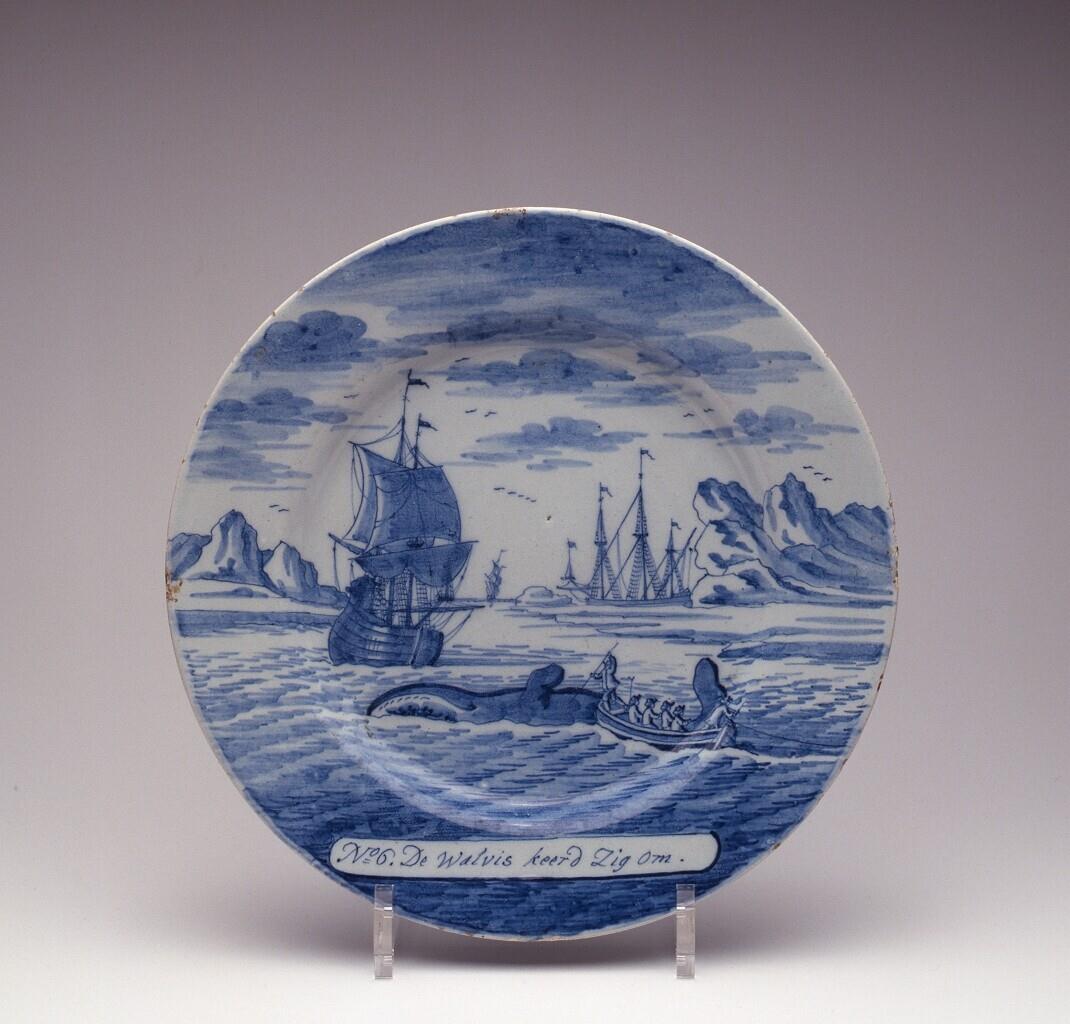 Bord met standring, zesde bord uit serie van twaalf borden met voorstellingen van de walvisvaart, met over de gehele voorkant in blauw geschilderde voorstelling 'walvis keert zich om'. Onderschrift: 'No 6. De Walvis keerd Zig om.' (Nederlands)