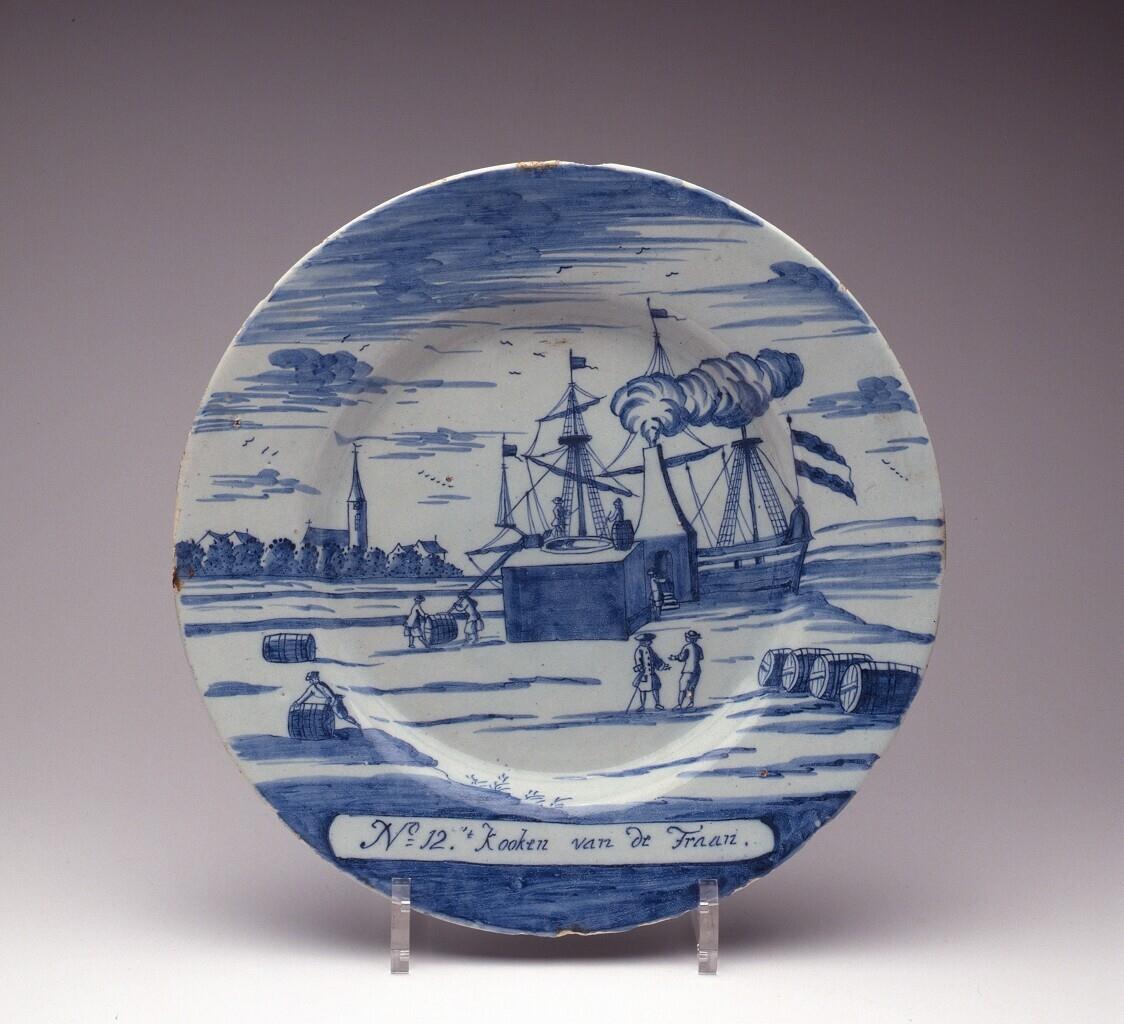 Bord met standring, twaalfde bord uit serie van twaalf borden met voorstellingen van de walvisvaart, met over de gehele voorkant in blauw geschilderde voorstelling 'koken van de traan'. Onderschrift: 'No 12. 't Kooken van de Traan.' (Nederlands)