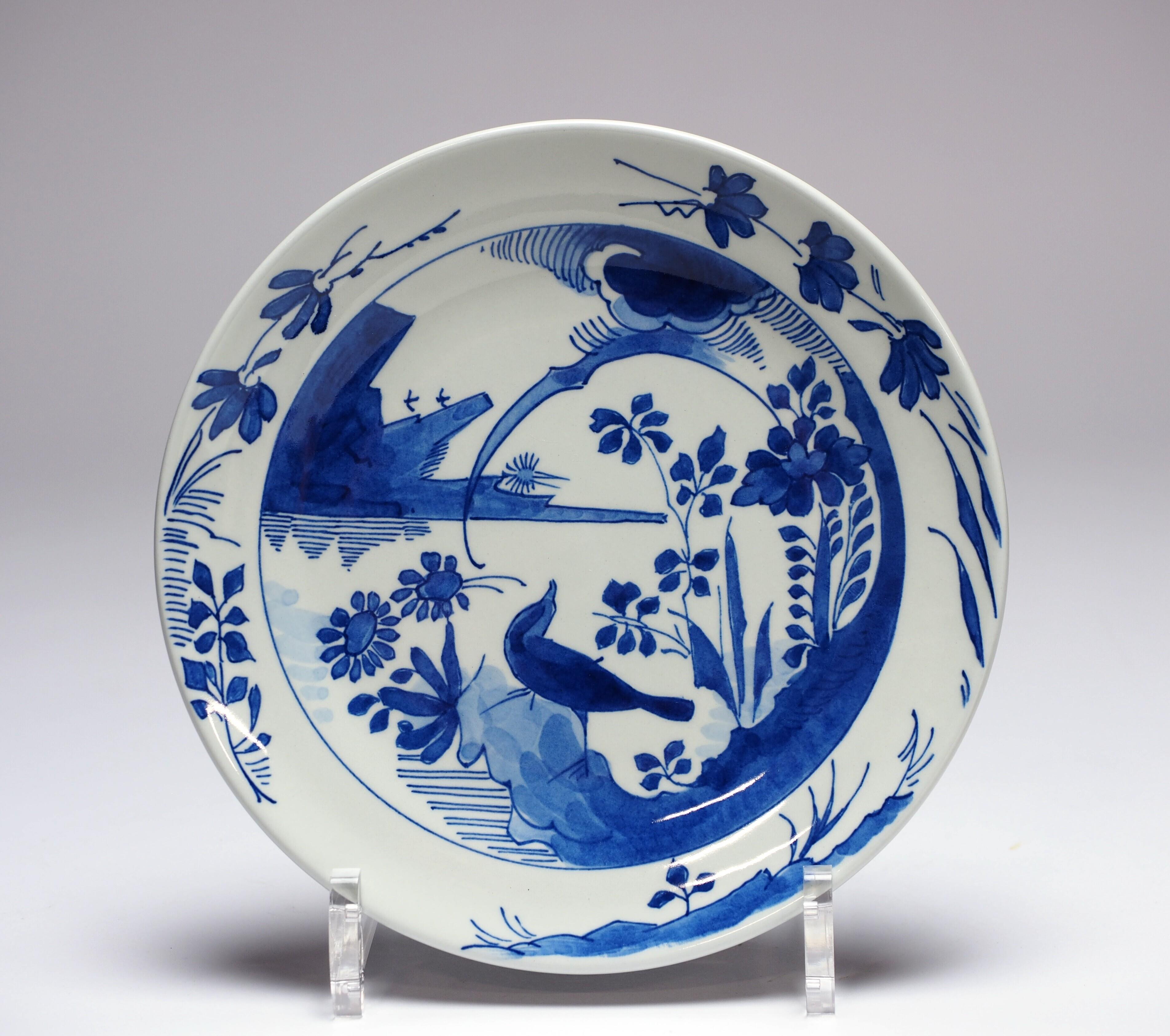 Bord, met standring, aan de voorkant gedecoreerd met een vogel op een soort rots met bloemen, geïnspireerd op 17de eeuwse in Kraakstijl uitgevoerde voorbeelden. Randdecoratie van oosters aandoende takken en twee concentrische ringen aan de achterkant. (Nederlands)