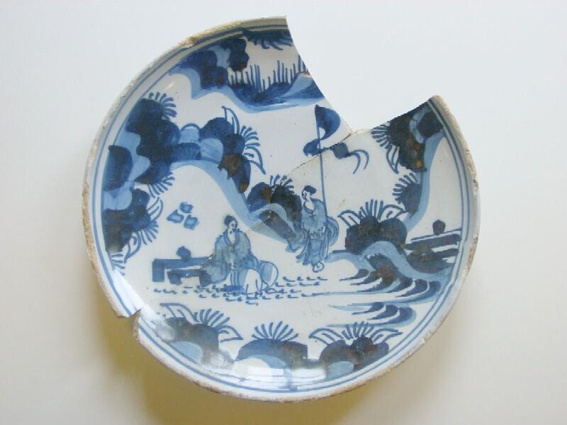 2 figuren (Chinezen?), (waarvan 1 staand met vaandel en 1 zittend; beiden met kruis om de nek) in (Chinees?) landschap; eromheen 2 concentrische cirkels afdrukken bakpennen standring; doorboord opstaande gebogen rand (Nederlands)