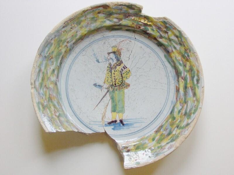 spiegel: pijprokende man met hoed, lans en vogel (valkenier); vlag: grove penseelstreken afdrukken bakpennen standvlak iets ingebogen rand (Nederlands)