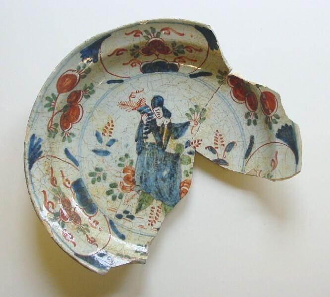 in blauw, groen en rood; spiegel: afbeelding van Vrouwe Fortuna met de Hoorn des Overvloeds, tussen bloemen en planten, met ontblootte borsten; vlag: bloem- en bladmotieven in cartouches afdruk bakpen standring ingebogen rand, knik naar spiegel (Nederlands)