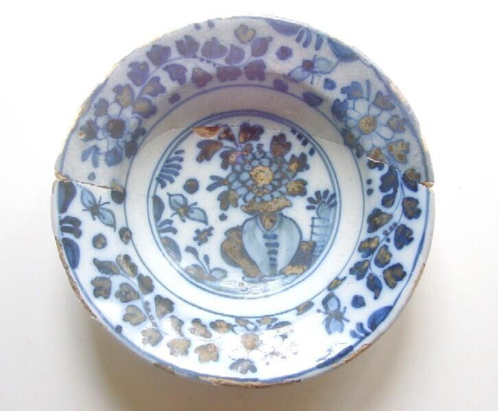 spiegel: vaas met bloemen en vlinder; vlag: bloem- en bladranken met vlinders ertussen; witte band tussen spiegel en vlag afdrukken bakpennen; ongelijk gedraaid; glazuurfout onderzijde; standring recht uitstaande rand, scherpe knik op spiegel, brede vlag (Nederlands)