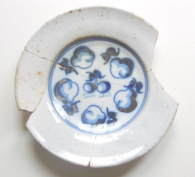 spiegel: fruitstilleven (kersen en peren); 2 concentrische cirkels om spiegel heen afdruk bakpen standvlak recht uitstaand, knik naar spiegel (Nederlands)