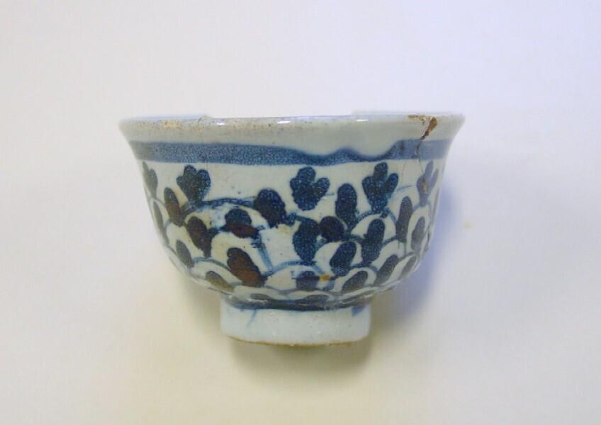 ext: visschub-motief; int. bodem: merkteken/penseelstreekmotief standring, hoog iets uitgebogen rand (Nederlands)