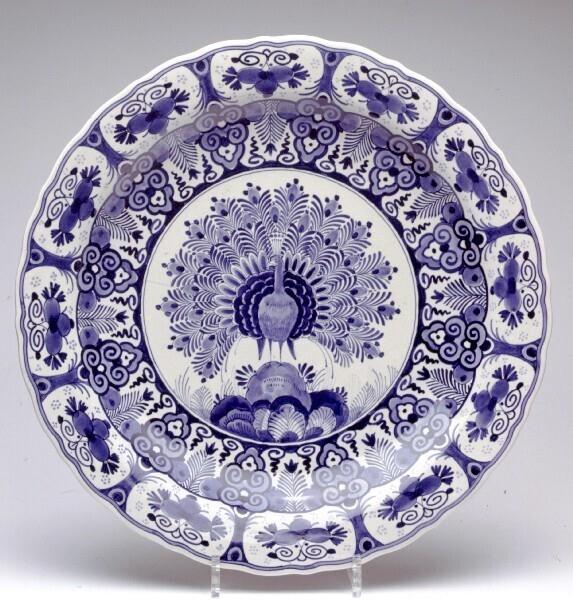 De met standring uitgevoerde schotel toont een voorstelling van een pauw met uitgewaaierde staart op een rots. Deze slechts op het plat wergegeven decoratie wordt omcirkeld door een puntvormige, naar buitengerichte band. De buitenrand tenslotte, wordt gevormd door uitgespaarde cartouches met gestileerd bloemwerk. De achterkant toont twee concentrische cirkels. (Nederlands)