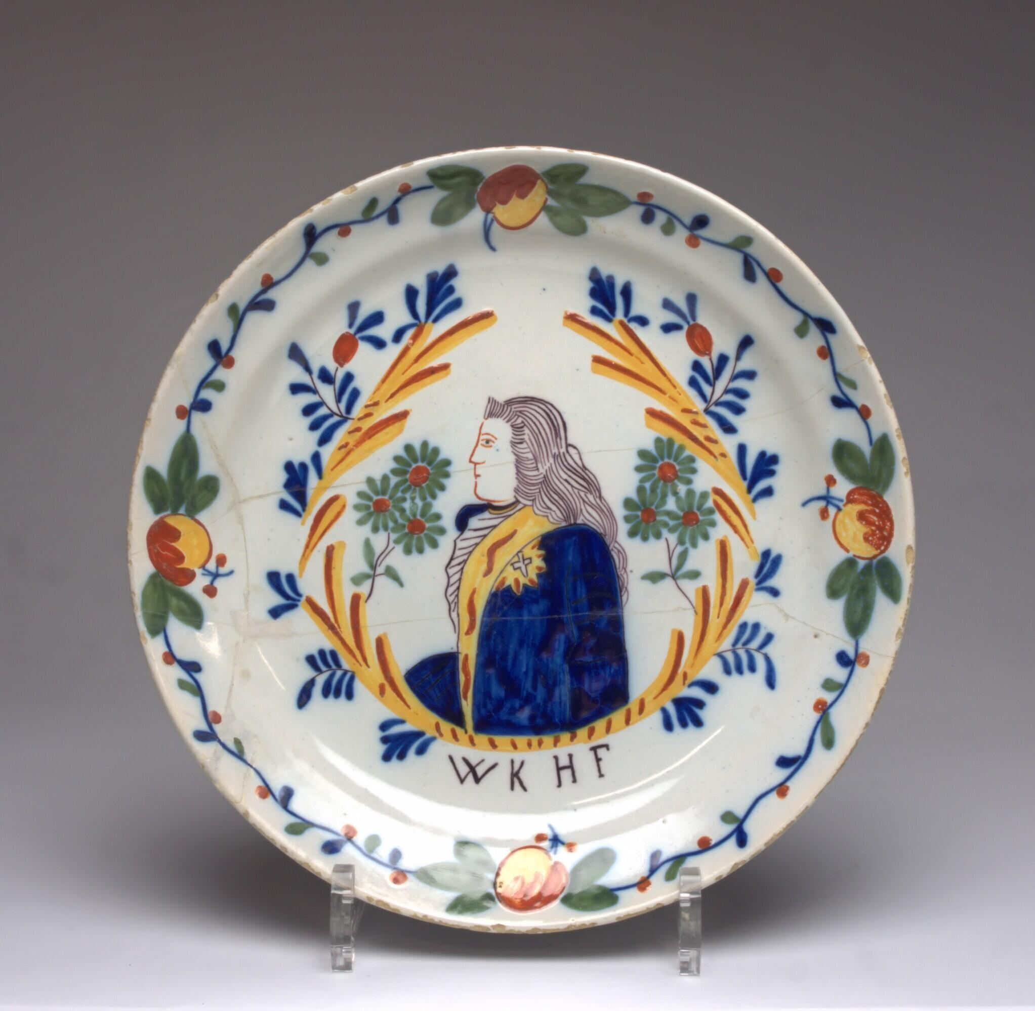 Bord zonder standring met op het plat een halfportret, en profil naar links, van prins Willem IV (1711 - 1751) met pruik en gehuld in blauw uniform met oranje sjerp, rozet en witte bef. Het portret is omlijst met een oranje krans met bloemranken. Op de rand een zoom van slingerende bloemenkrans met oranje appels. opschrift middenonder: 'W K H F' (Nederlands)