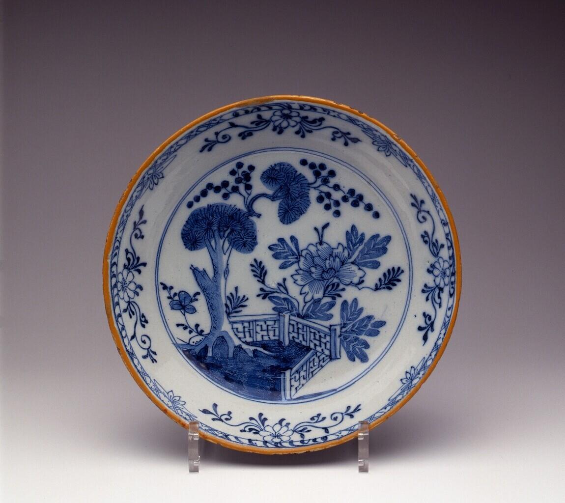 Diep bord met voorstelling van Chinese tuin met boom, hekwerk en bloeiende pioenroos, omsloten door dubbele ring, ornamenten op rand bestaande uit bladerrankjes, met okergele rand. (Nederlands)