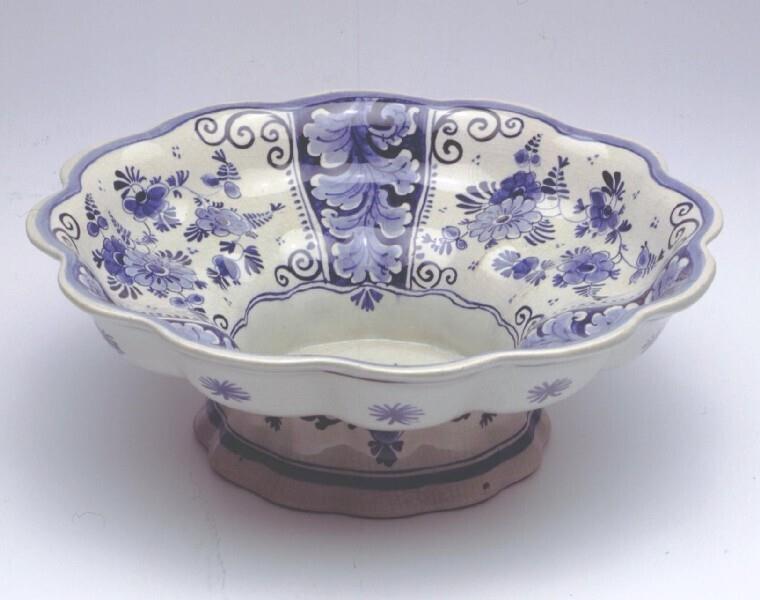 De geschulpte schaal staat op een verhoogde, ingesnoerde voet. De binnenkant is verdeeld in alternerend drie grote en drie kleine vakken, die deels in spaartechniek zijn opgevuld in bloem- en bladwerk. In het verdiepte midden is een trosje druiven afgebeeld. De buitenkant is voorzien van enkele bloemen. (Nederlands)
