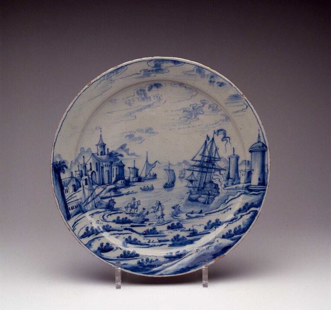 Bord, over het hele bord beschilderd met een Italianiserend havengezicht (Nederlands)