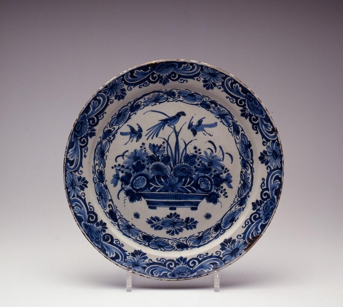 De achterkant van het bord is zonder standring uitgevoerd en loopt een weinig bol naar het vlakke middendeel. De wand is versierd met drie concentrische cirkels. Aan de voorkant is in het plat een afbeelding van een gevulde bloemenmand weergegeven, met vogels. Op de vertreding wordt dit omgeven door slingerende bloemenranken. De randdecoratie bestaat uit gestileerd acanthusblad alternerend met bloem- en rankmotieven. (Nederlands)