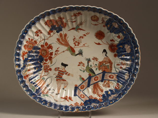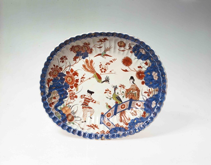 Ovaal wesbekken met een rechte bodem en een sterk geschulpte, bol verjongende wand, polychroom gedecoreerd op een grijswit glazuur. Het wasbekken is gedecoreerd met een chinoiseriedecor in imari kleuren met bloemen, twee pauwen, hekje, vrouw en een dansend figuur. De rand is versierd met een blauw met gouden rand en extern is de waskom gedecoreerd met slingers van bloemen en bladeren. (Nederlands)