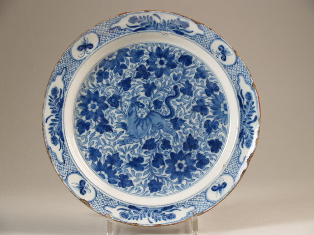 Bord, met decoraties in blauw op een wit glazuur. Het plat is versierd met een decor van een draak omringd door een bloemen en ranken decor. De rand is gedecoreerd met een ruitpatroon met daarin vier cartouches met een plantdecoratie en vier kleinere met daarin een insect. (Nederlands)