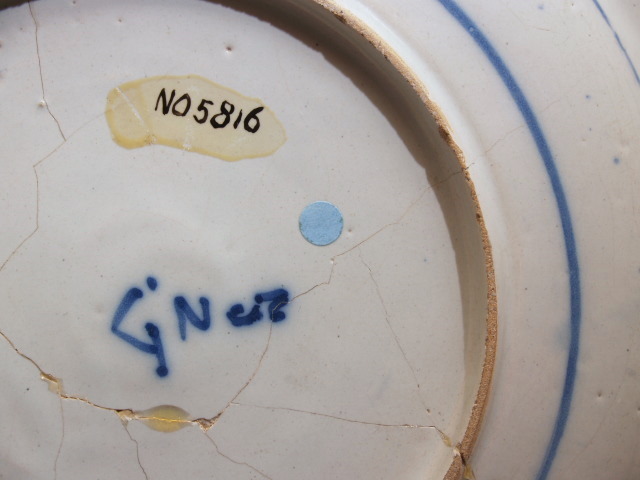 Rond bord met een rechte bodem op trapezoide voetring, eerst bol dan recht verjongende wand met gegolde lip. In blauw ge...722-1724)||De Dubbelde Schenkkan, plateelbakkerij (periode Jacob van Thiel 1715-1735)||Keramiekmuseum Princessehof NO 05816