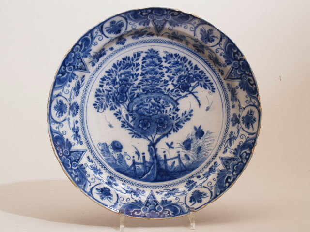 De schotel is op het plat gedecoreerd met de voorstelling van een bloeiende theeboom voor een hekje. De voorstelling wo...motieven.||Delft||De Witte Ster, plateelbakkerij (periode Cornelis Brouwer 1724-1738)||Keramiekmuseum Princessehof NO 05834