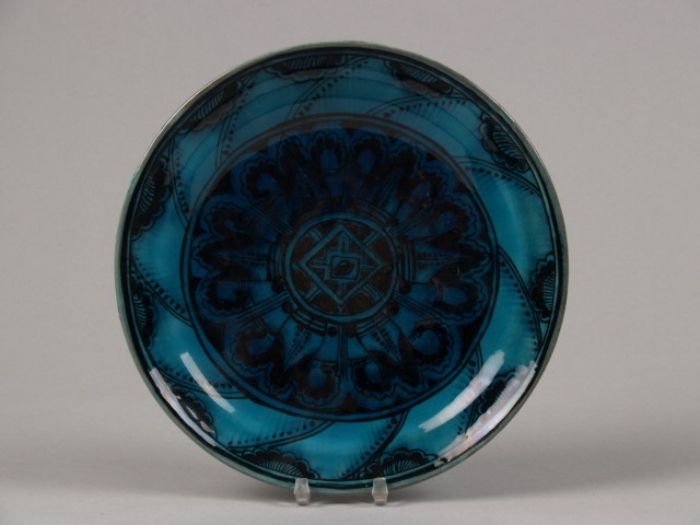 Bord met geabstraheerd floraal decor in de kleuren turkoois, blauw en zwart uit de productielijn Nieuw-Delfts aardewerk (Nieuw Perzisch) van De Porceleyne Fles. Met het ‘Nieuw-Delfts’ richtte De Porceleyne Fles zijn blik op de eeuwenoude keramiek uit het Midden-Oosten. Sommige modellen en decoraties werden letterlijk nagemaakt, maar vaak waren het ook eigen interpretaties. (Nederlands)