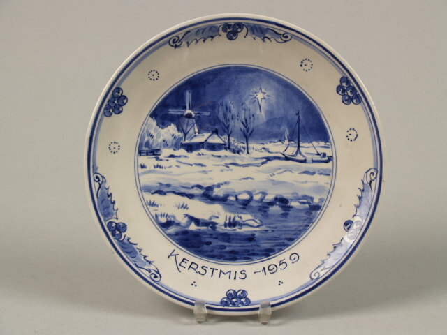 Gelegenheidsbord met landschappelijk decor van winterlandschap met molen en tekst: 'Kerstmis 1959'. Sinds 1915 brengt De Porceleyne Fles ieder jaar een nieuw kerstbord op de markt. De voorstelling op deze handbeschilderde borden is per jaar geheel anders en de voorstellingen worden alleen in het jaar van uitgave en op bestelling geschilderd. (Nederlands)
