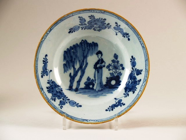 Bord, in blauw gedecoreerd op een grijswit glazuur. Het plat is versierd met voorstelling van een vrouw in een gestileerd landschap met bomen, de rand is versierd met drie takken met bloemen en vruchten en afgezet met een gearceerde blauwe en een gele bies. (Nederlands)