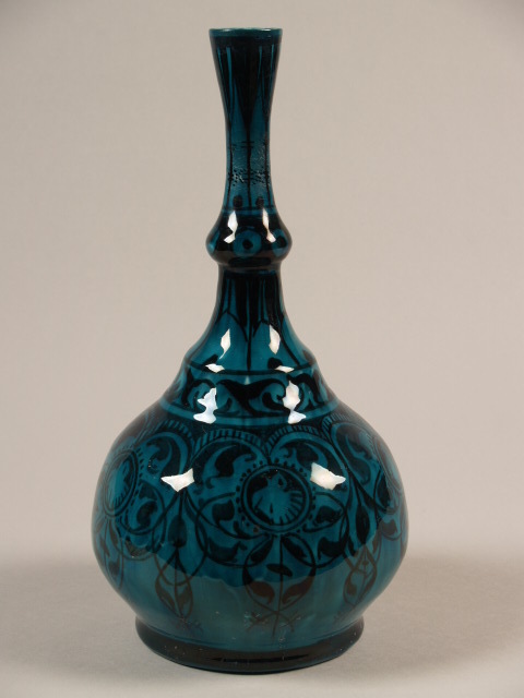 Flesvaas met bolle buik en hoge, smalle hals, gedecoreerd met een gestileerd floraal decor, uitgevoerd in het zogeheten Nieuw-Delfts aardewerk (Nieuw Perzisch). Met het ‘Nieuw-Delfts’ richtte De Porceleyne Fles zijn blik op de eeuwenoude keramiek uit het Midden-Oosten. Sommige modellen en decoraties werden letterlijk nagemaakt, maar vaak waren het ook eigen interpretaties. (Nederlands)