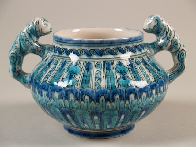 Pot (model 11) met twee oren in de vorm van een panter en decor in Iznik-stijl, zogenoemd Nieuw-Delfts. 1910 – 1949. Met het ‘Nieuw-Delfts’ richtte De Porceleyne Fles zijn blik op de eeuwenoude keramiek uit het Midden-Oosten. Sommige modellen en decoraties werden letterlijk nagemaakt, maar vaak waren het ook eigen interpretaties. Het bijzondere aan deze pot is dat het model is ontleend aan een Perzisch voorbeeld, terwijl de decoratie geïnspireerd is op die uit de Turkse stad İznik. (Nederlands)