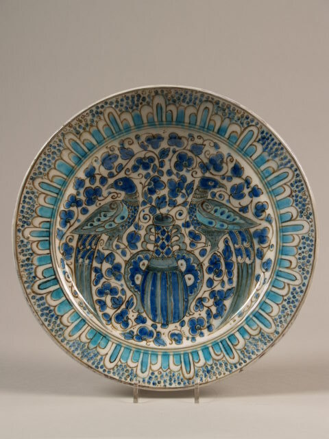 Schotel met op het plat een decoratie van een vaas met aan weerszijden een vogel. Uitgevoerd in turkoois, blauw en wit i...yne Fles v/h Joost Thooft en Labouchère, Delftsch Aardewerkfabriek||Dessens, J.Th.||Keramiekmuseum Princessehof BP 2007-027 |