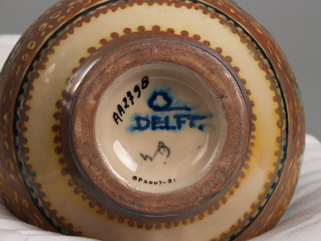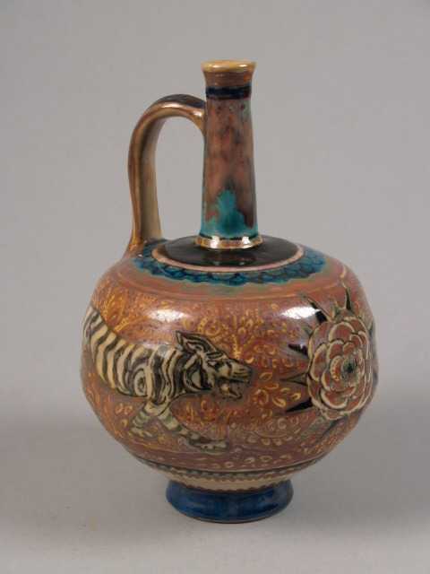 Een fles met bolle buik, smalle hals en staand oor, versierd met een floraal decor met leeuw en tijger. In 1876 werd De Porceleyne Fles overgenomen door Joost Thooft. Onder leiding van Thooft en Adolf le Comte ontwikkelde de fabriek diverse soorten Vernieuwingsaardewerk, waaronder het Nieuw Delfts dat tussen 1910 en 1936 in productie was. Hierbij werd donkerbakkende klei voorzien van een witte laag en voorzien van beschilderingen die qua motieven en kleurgebruik geïnspireerd waren op Perzisch aardewerk uit de 12e- en 13e-eeuw. In deze serie werd tevens geëxperimenteerd met lusterglazuren. (Nederlands)