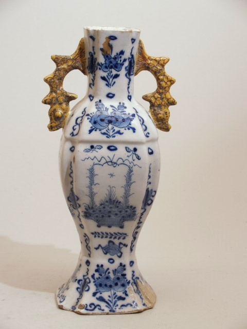 Balustervaas met oren met puntmotief, de vaas is gedcoreerd in blauw op wit, de oren zijn polychroon beschilderd. Op de buik is de vaas op alle zijdes gedecoreerd met een voorstelling van een mand met bloemen. Verder is de vaas voorzien van florale motieven. (Nederlands)