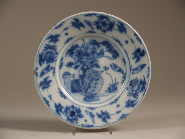 Vlakke bodem, iets getrapt spreidende wand, zeer duidelijke forse pensporen. Gele scherf, helder wit tinglazuur, in blau...l, (b) op het plat een stilleven van Chinese vazen en bloemen.||Delft||onbekend||Keramiekmuseum Princessehof OKS 1989-007.B