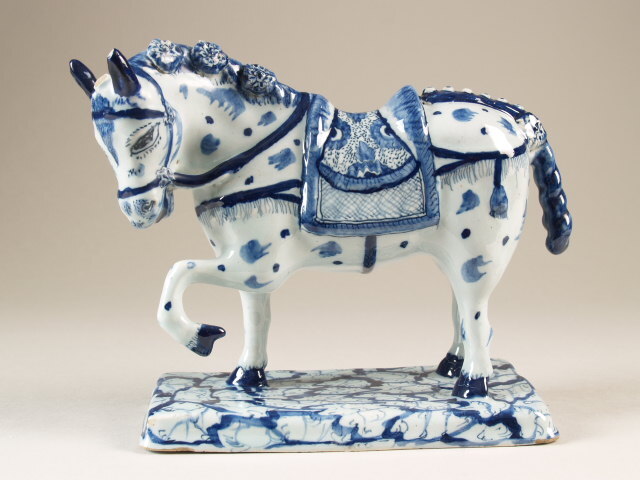 Beeld in de vorm van een staand, opgetuigd paard, in blauw-wit gedecoreerd. Het linkerbeen is opgetild, het hoofd naar b... decor. Het beeld is onderdeel van een stel van twee stuks, die naar elkaar gericht zijn.||Delft||Princessehof OKS 1998037B