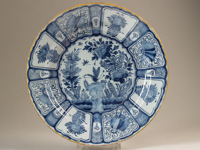 Ronde schotel, in blauw gedecoreerd op een blauwig wit glazuur. Centraal gedecoreerd met een op Chinese voorbeelden geïnspireerde voorstelling van een tuin met libelle op een rots, bloemen en een vlinder. De rand is verdeeld in zestien gedecoreerde vakken. (Nederlands)