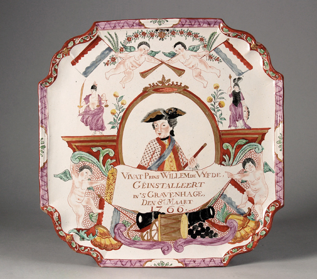 Vierkante plaat of cabaret met ingesneden accoladevormige hoeken en polychrome schildering. Het centrale -decor bestaat uit een cartouche met kroon waarin een afbeelding van prins Willem V. Op de voorgrond staan twee putti die een banderol met tekst ophouden boven krijgsattributen zoals kanonnen, kanonskogels en een trom. Achter de cartouche is een console waarop ter weerszijden van de cartouche een allegorisch persoon staat afgebeeld: ter linker zijde vrouwe Justitia met zwaard en weegschaal en ter rechter zijde de Hollandse maagd met helm, speer en schild. Boven de cartouche en console zweven twee hoornblazende putti met Nederlandse vlaggen onder een bloemslinger. (Nederlands)