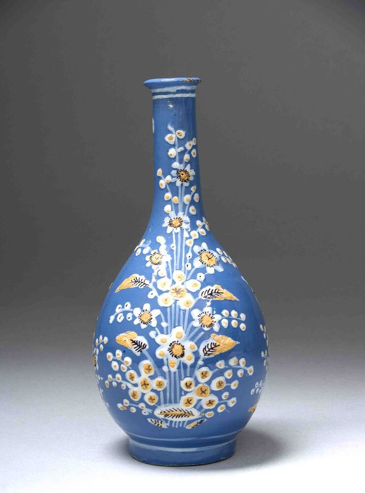 Een van twee flesvazen op standringen met ronde, eivormige lichamen, uitlopend in lange, smalle cilindrische halzen. De vazen hebben een schildering van bloem- en bladertakken die vanuit een grondje verticaal omhoog steken in wit, geel en paars op een lavendelblauw berretino fond. (Nederlands)