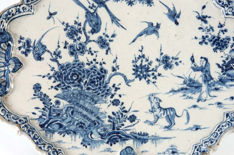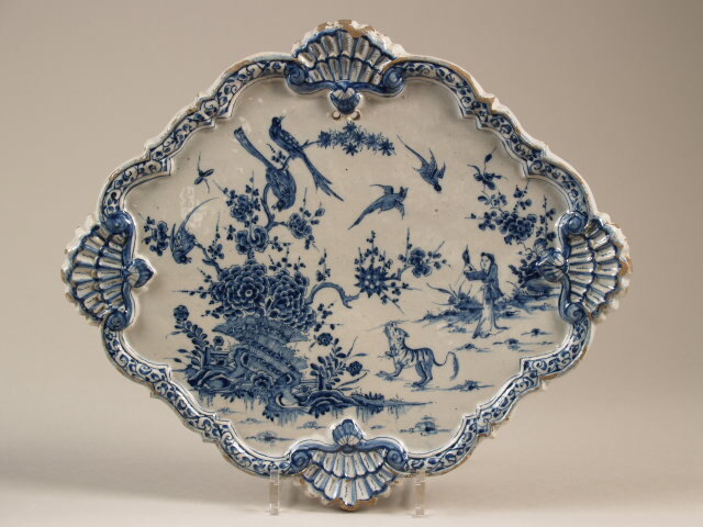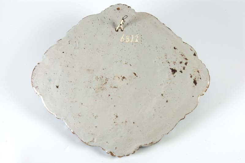 Ruitvormige plaquette, in blauw gedecoreerd op een wit glazuur met een voorstelling van een dame met hond in een bloementuin met verscheidene vogels en een katachtige. De verhoogde rand is beschilderd met arabesken en heeft schelp-ornamenten op de hoeken. (Nederlands)