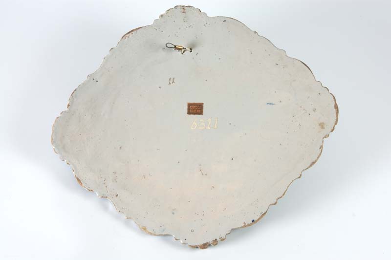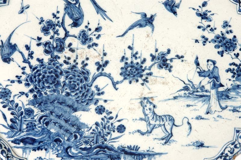 Ruitvormige plaquette, in blauw gedecoreerd op een wit glazuur met een voorstelling van een dame met hond in een bloementuin met verscheidene vogels en een katachtige. De verhoogde rand is beschilderd met arabesken en heeft schelp-ornamenten op de hoeken. (Nederlands)